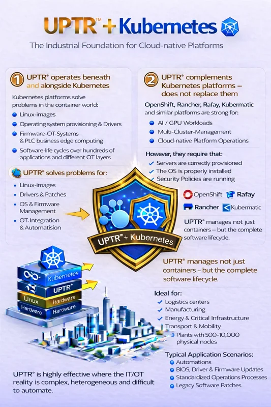 While large Kubernetes platforms like OpenShift or Rancher address the orchestration of Kubernetes clusters, UPTR™ automates the entire technical infrastructure that actually exists in industrial, logistics and critical infrastructure environments: heterogeneous systems, physical servers, edge devices, software versions, security, provisioning and Lifecycle Management.